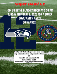 Blarney Room Lounge opens at 2:30 on Super Bowl Sunday February 8, 2026!