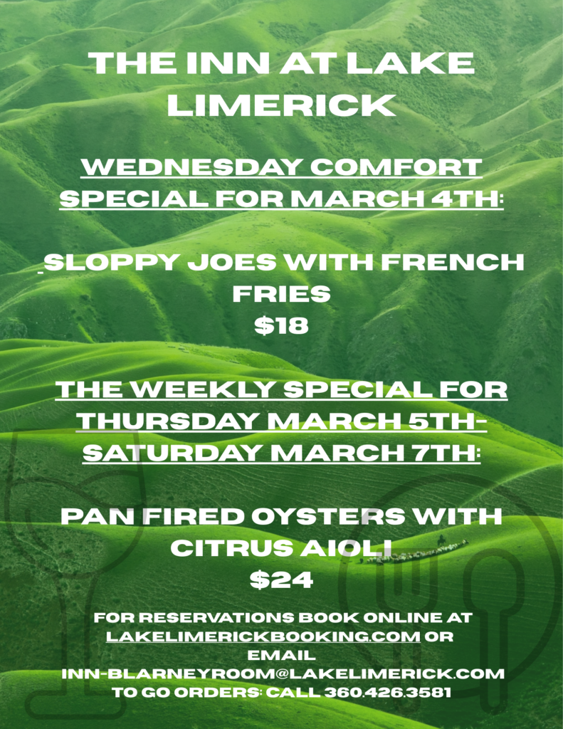 The Inn at Lake Limerick Wednesday Comfort Food Special (03/04) and Weekly Special (03/05-07)